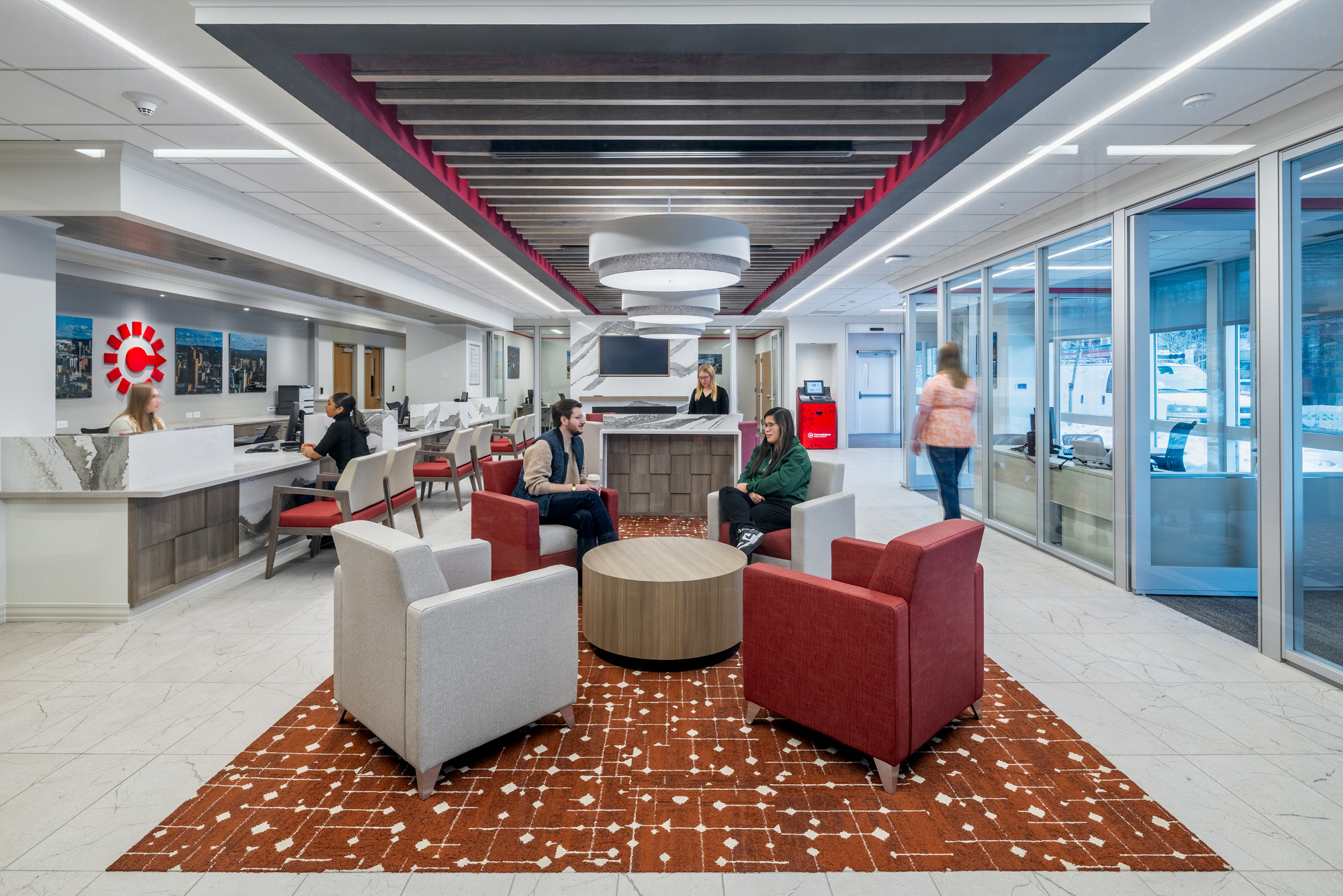 The final color palette and materials used throughout the space were developed in close collaboration with CNB’s facilities project manager, architectural designer, and branding team, resulting in a final palette of bold red accents with warm neutral tones.