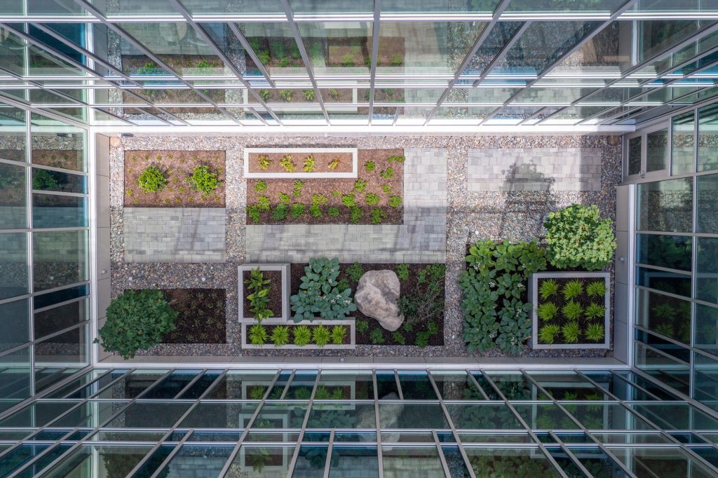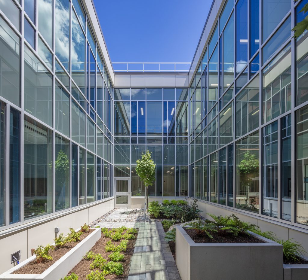 As the heart to the facility, the central courtyard was designed to connect each distinct department with a unifying space, filled with filtered daylight, vibrant plant life and integrated through the building with immersive wall art.