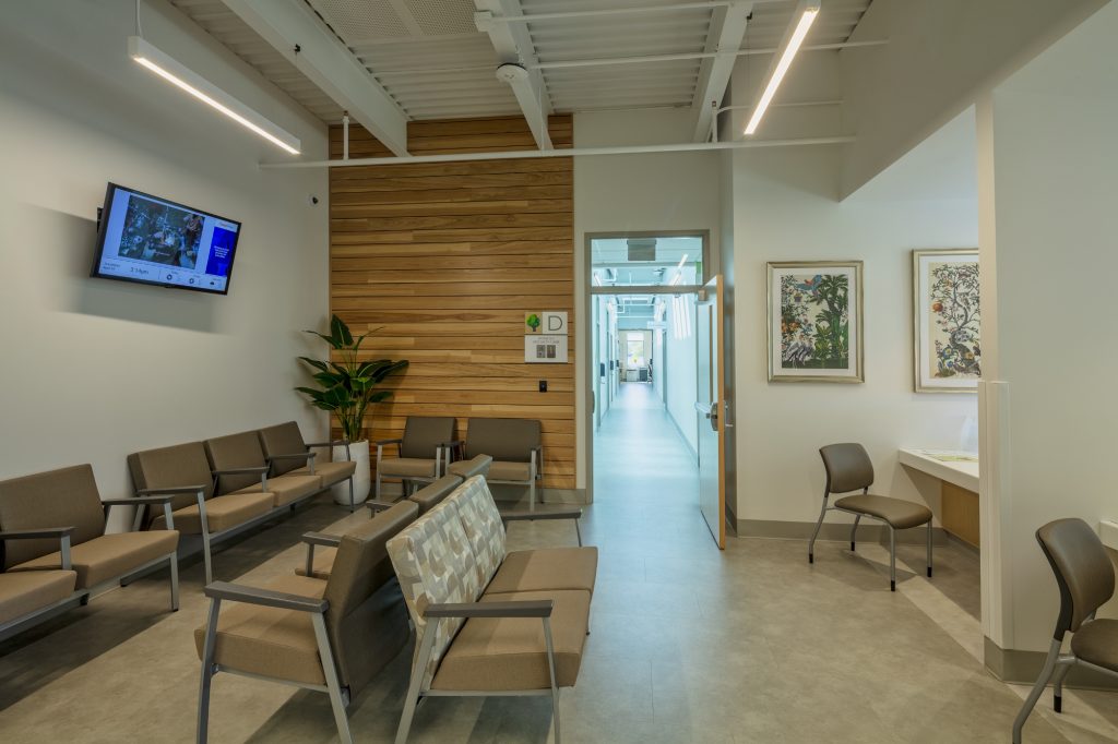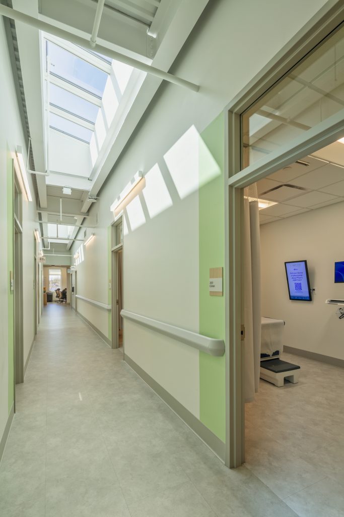 With this approach, patients may be seen by several different specialists from the comfort of one room. The various departments are organized into ‘pods’ where exam and support spaces can be flexibly shared as demand and use changes throughout the day. The layout of the building is efficient, however adaptable to the ever-changing needs of healthcare.
