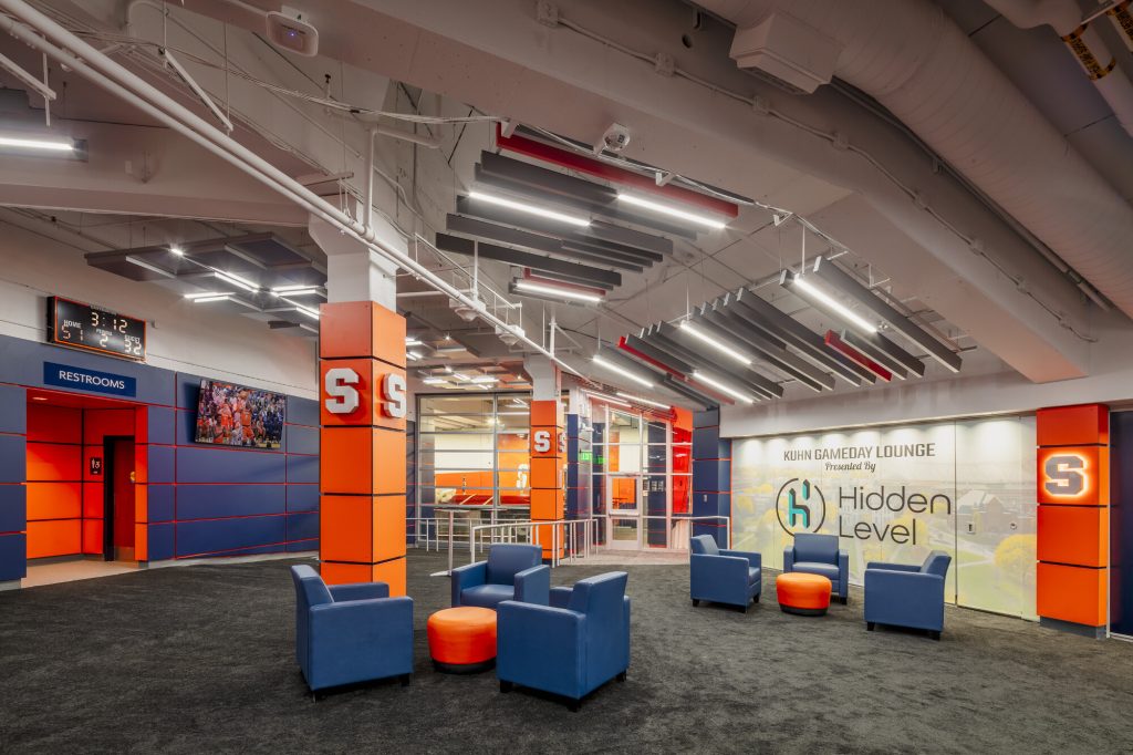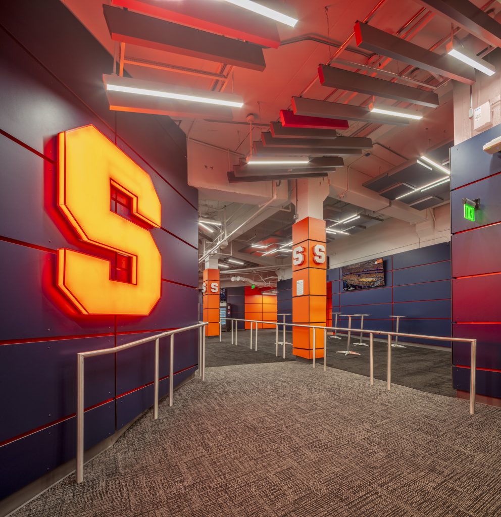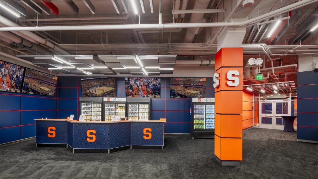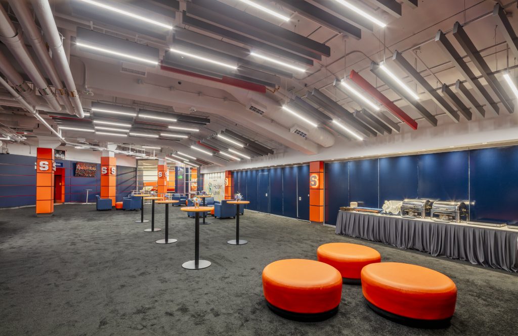 The interior design intentionally incorporates Syracuse University’s signature orange and blue color palette, reinforcing the university’s brand identity and creating a cohesive visual connection to the surrounding athletic environment.