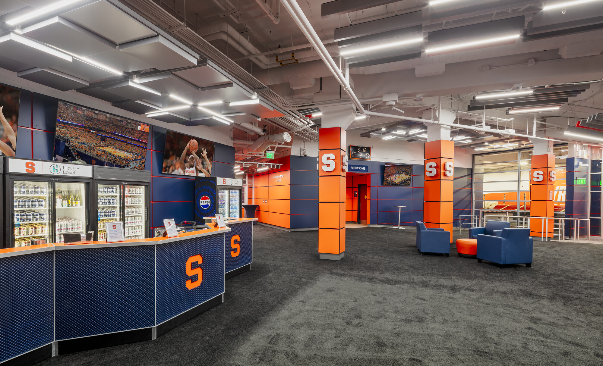 The interior design intentionally incorporates Syracuse University’s signature orange and blue color palette, reinforcing the university’s brand identity and creating a cohesive visual connection to the surrounding athletic environment.