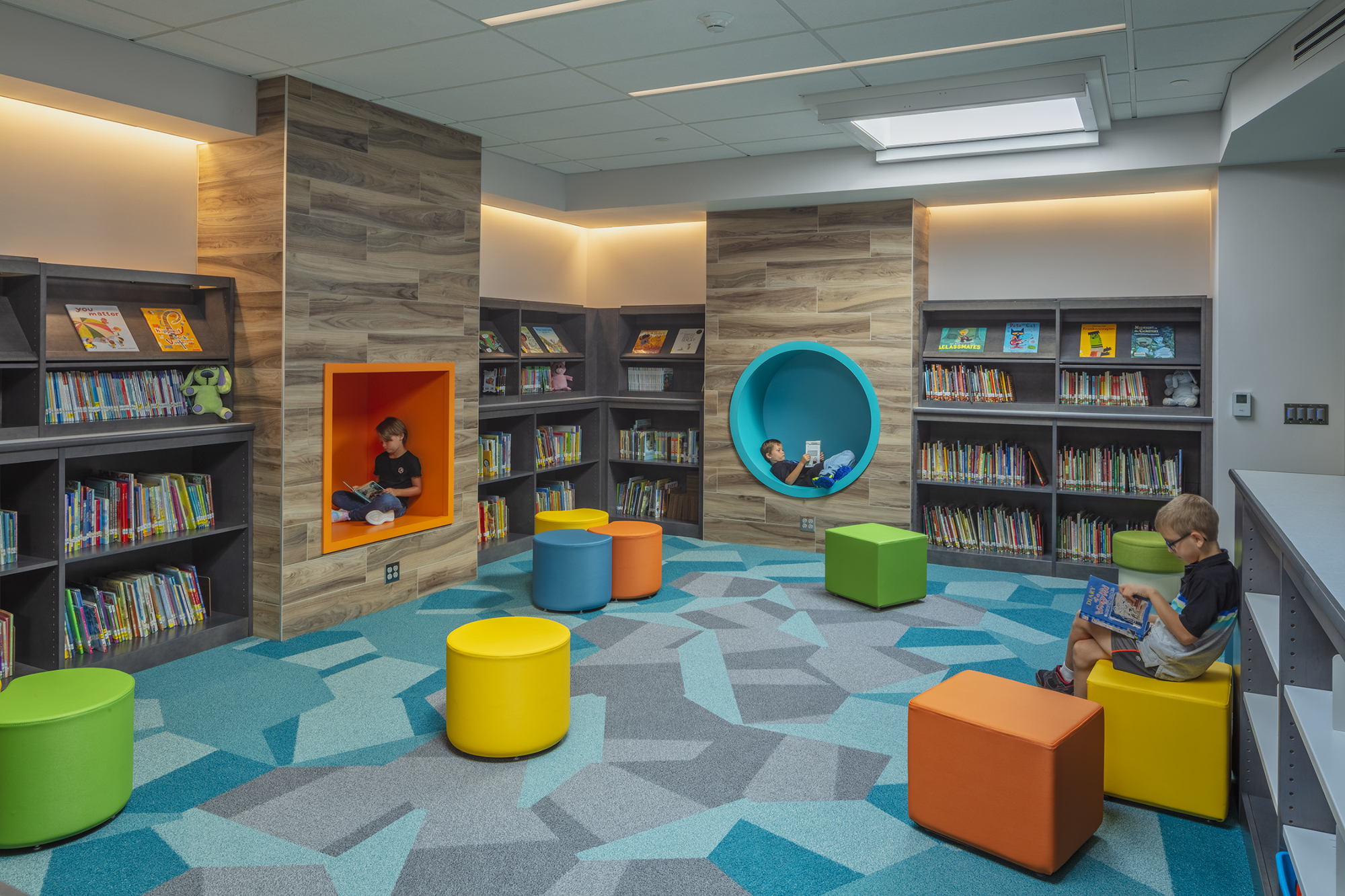 Built-in nooks in a variety of colors and shapes offer students a quiet, yet fun place to enjoy a book.